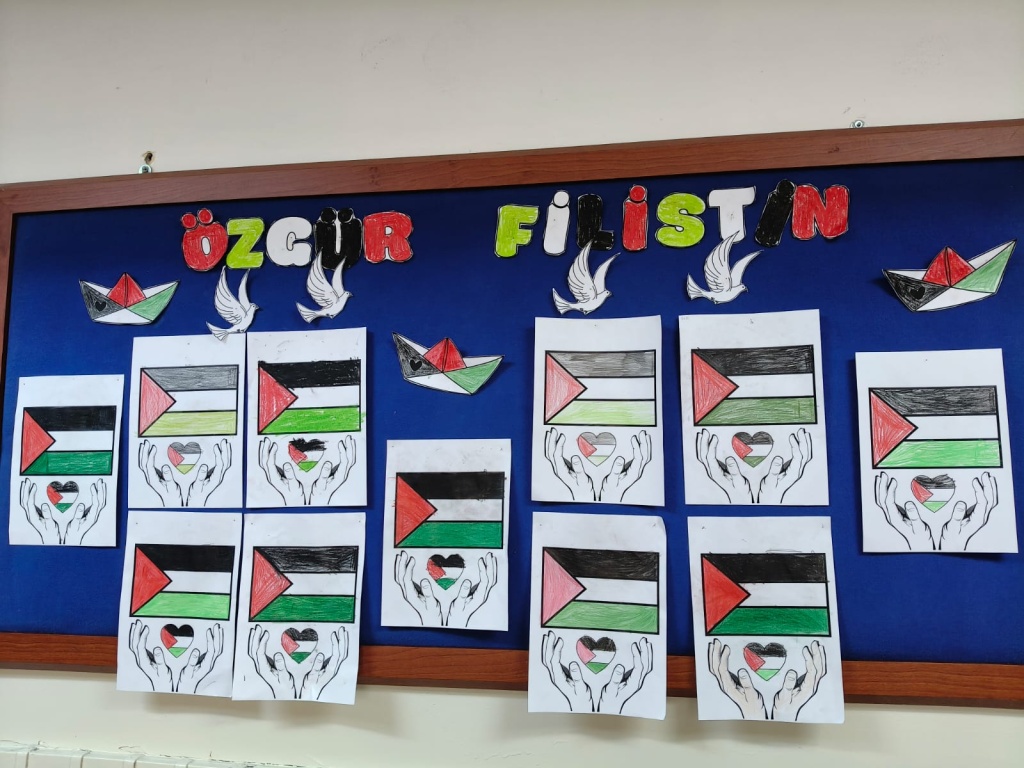 Filistin’de yaşanan insanlık dramına dikkat çekmek ve öğrencilerimizde duyarlılık oluşturmak amacıyla okulumuzda farkındalık etkinlikleri gerçekleştirdik. Kalbimiz Filistin’de.